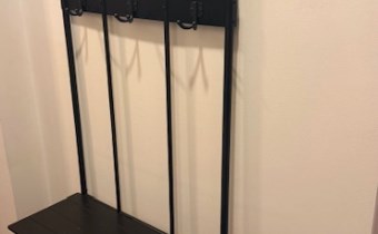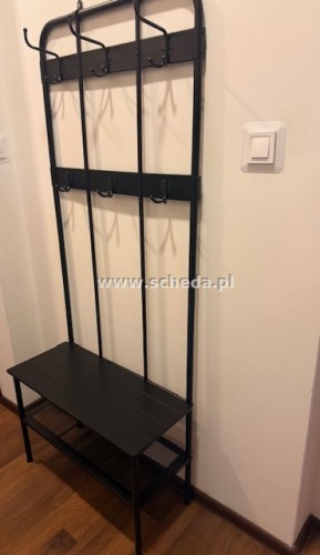 Przedpokój: zabudowana szafa z półkami i dużym lustrem, wieszak na ubrania oraz półki na buty.